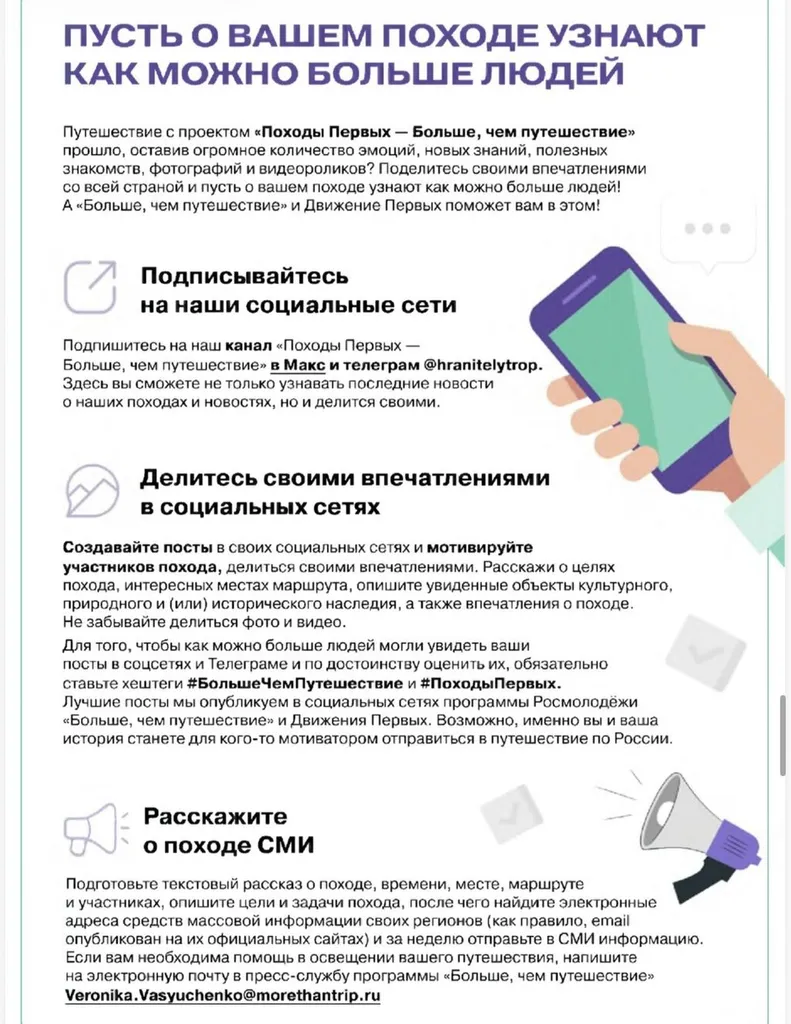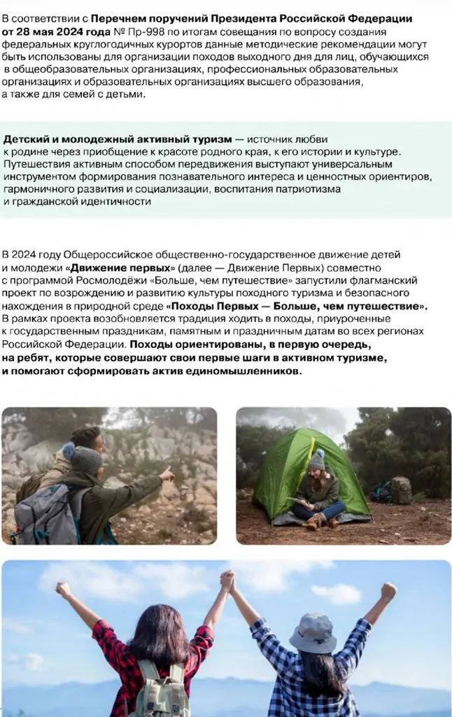 Министерство труда и соцразвития Краснодарского края информирует, что в рамках проекта «Походы первых – Больше, чем путешествие», реализуемого совместно с Росмолодежью и «Движением первых», запланирована серия походов «Время открытий».