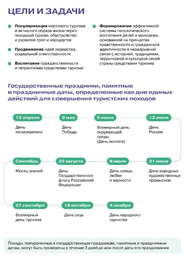 Они приурочены к государственным праздникам и памятным датам. Проект направлен на развитие массового походного туризма среди детей и молодежи для патриотического воспитания и формирования культуры путешествий по стране.